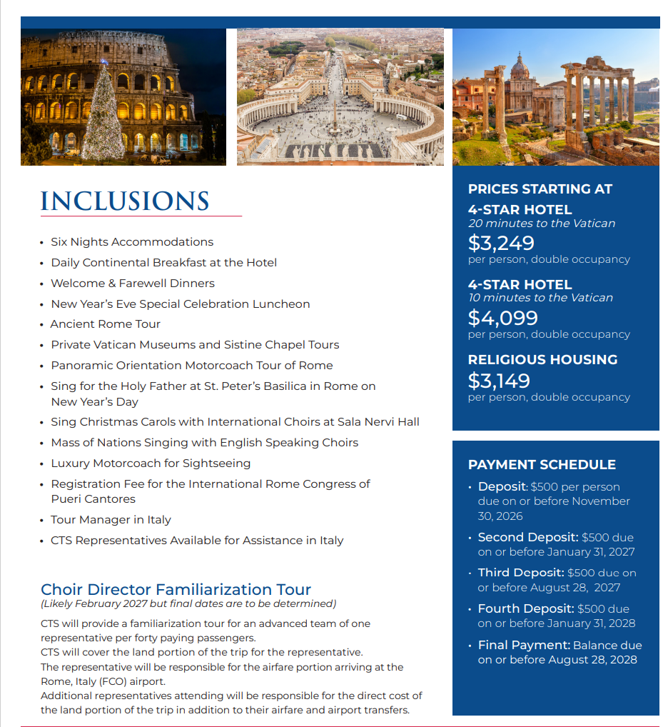 This would be open for ANY St. Benedictine Choir Member (current and alumni) who would be in 4th grade or older in December 2028. Parents and family members are welcome to join the travel experience and be a part of a once-in-a-lifetime opportunity.